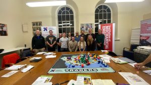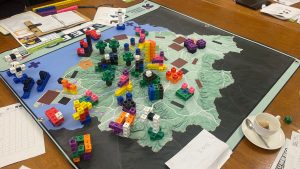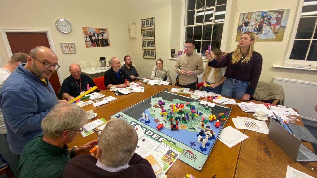 Cumbria Traders is a team-based strategy workshop themed on the diverse industries of Cumbria. The class aim is to grow the Cumbrian economy into a thriving and sustainable region, but this can only be achieved through cooperation between teams. A giant construction and resource map is used to emulate progress.